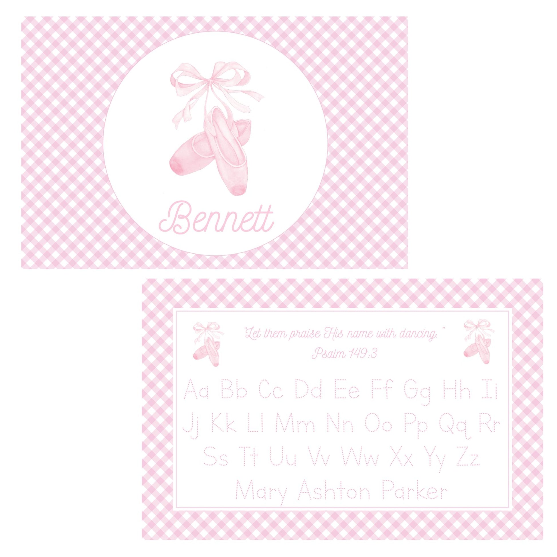 These 11x17 Placemats are pretty and fun. This can come with or without a verse and has letters on the back for practicing her name.