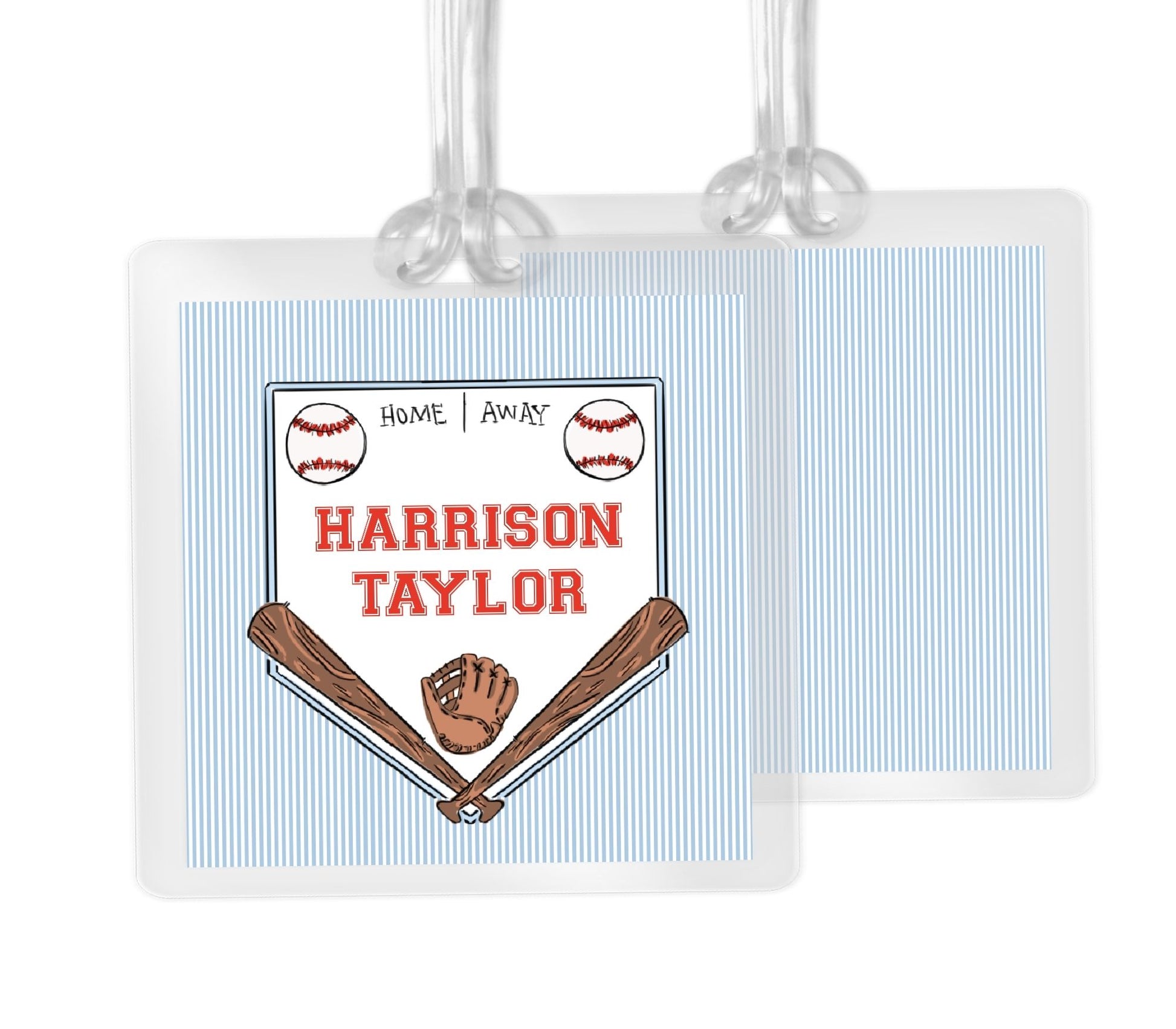 2.75x2.75 laminated bag tag. Front and back.