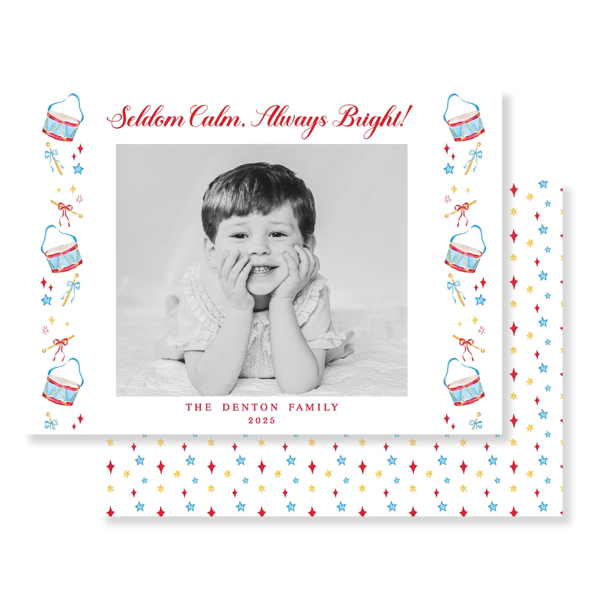Christmas Cards are 5x7 and printed on heavy, white 120 lb thick cardstock. Standard white envelopes are included.