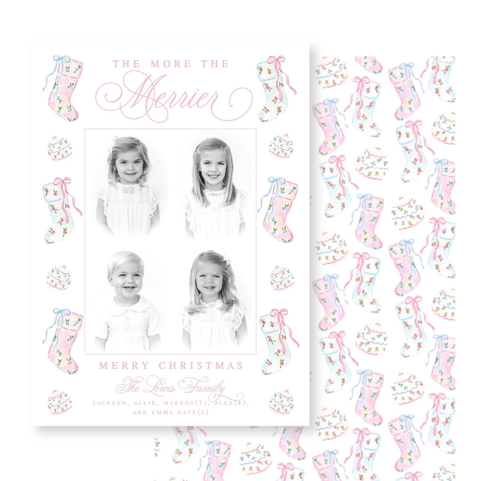 Christmas Cards are 5.5 x 8.5 and printed on heavy, white 120 lb thick cardstock. Standard white envelopes are included.