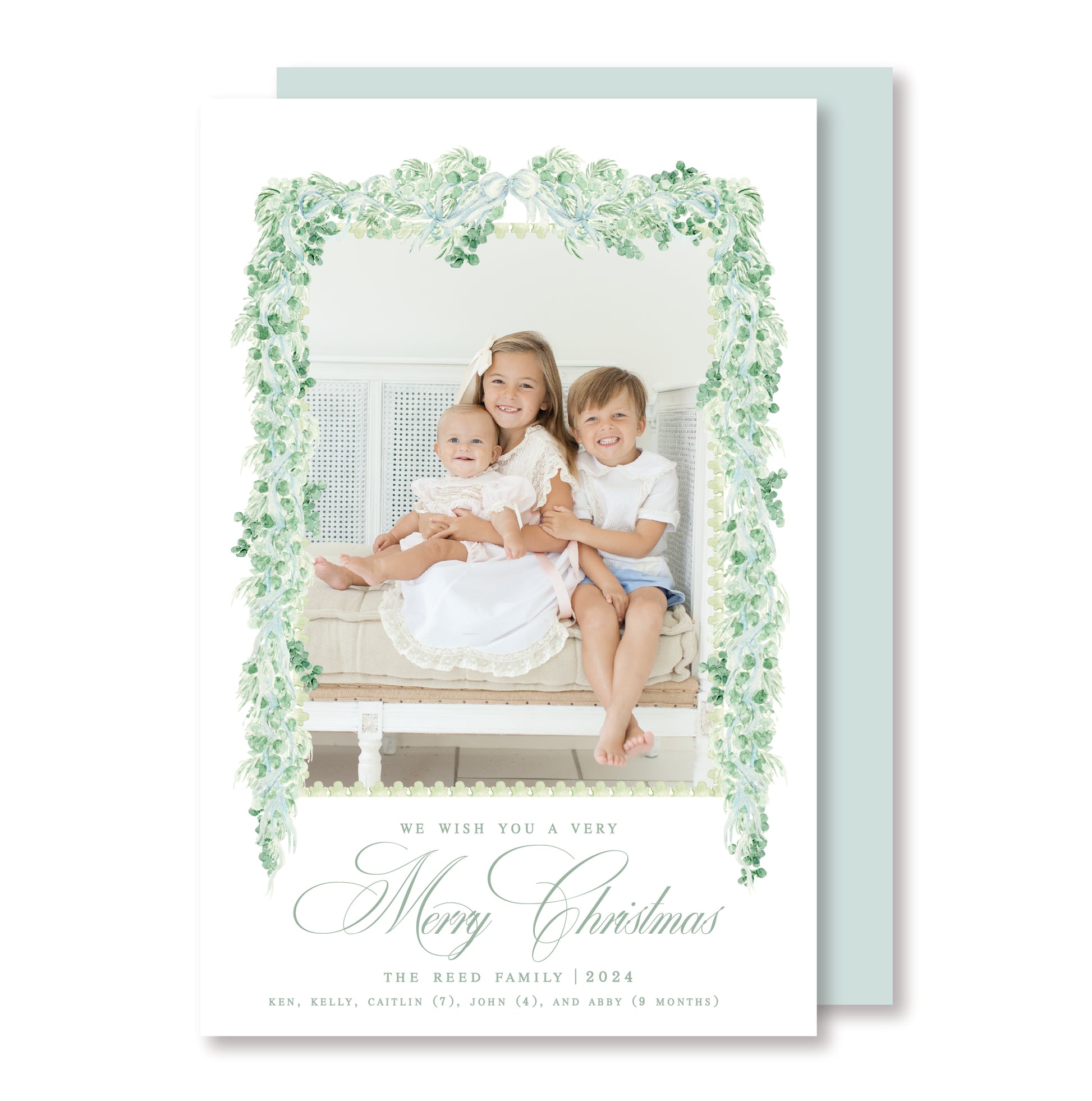 Christmas Cards are 5.5x8.5 and printed on heavy, white 120 lb thick cardstock. Standard white envelopes are included.