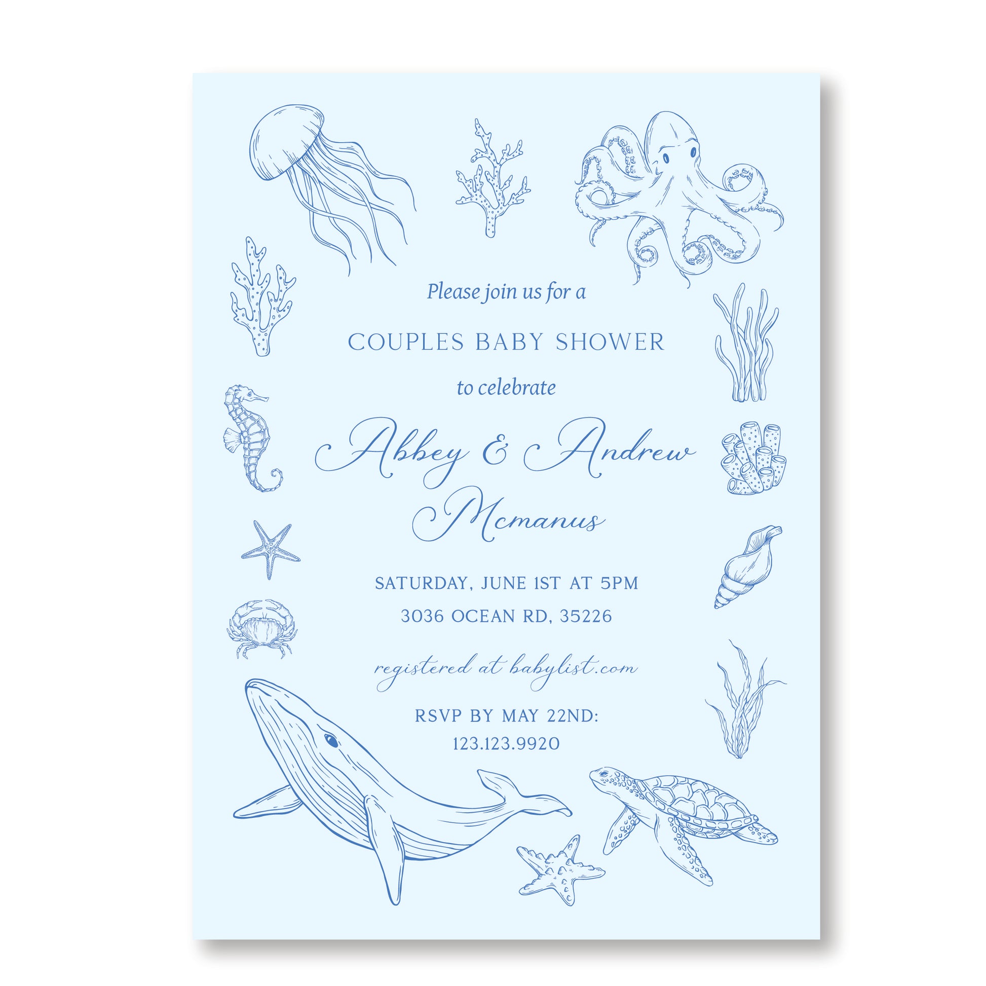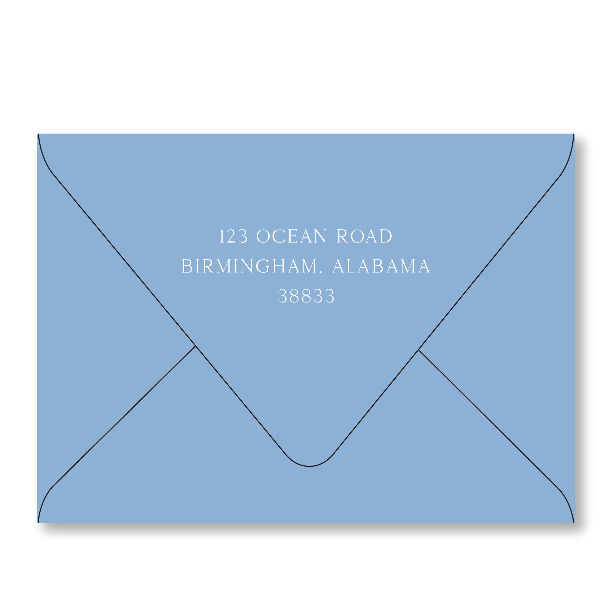 This invitation is printed on 120 lb. eggshell white card stock and includes envelopes. Choose Europflap option for blue envelopes.