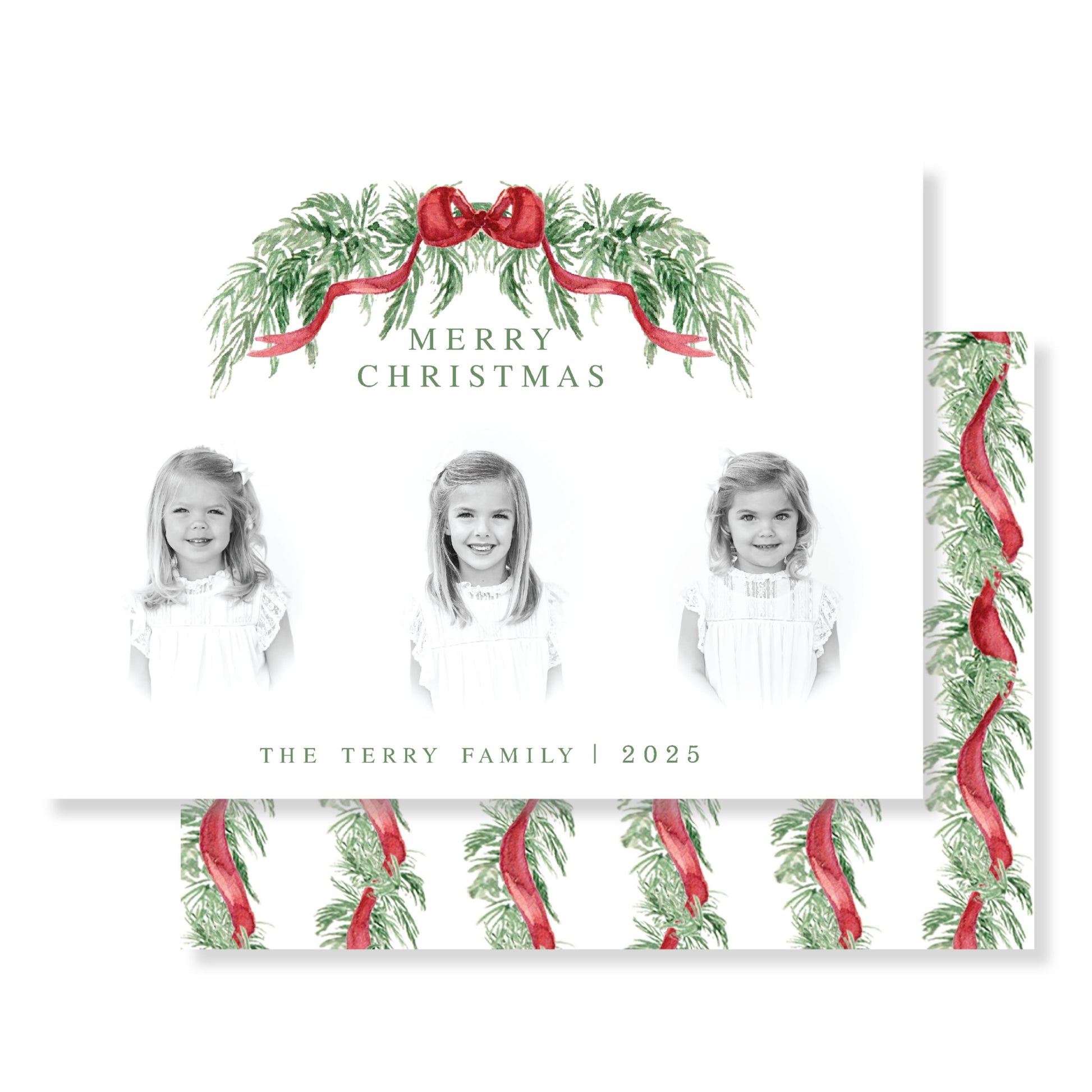 Christmas Cards are 5.25 x 7.25 and printed on heavy, white 120 lb thick cardstock. Standard white envelopes are included.